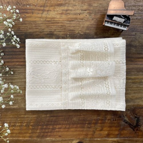 オフベージュ色の光沢ある上質レース生地、花柄ストライプ柄を